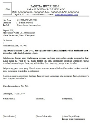 Sehubungan dengan akan diadakannya segenap rangkaian acara dalam rangka menyambut hari ulang tahun RI yang ke-71, maka dengan ini kami mengharap kesediaan Bapak/Ibu untuk memberikan sumbangan dana yang dibutuhkan demi terselenggaranya acara tersebut.